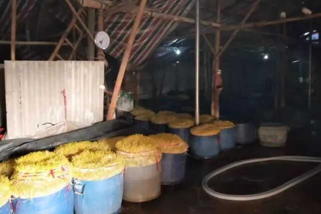 行动期间,民警发现该平房隔壁两处自建房同样存放着正在制作中的“问题豆芽”,现场抓获犯罪嫌疑人邱某(男,53岁,广东茂名人)。民警在3个黑作坊内查获392桶“问题豆芽”共4万斤,100桶“问题酸菜”共5千斤,现场缴获芽康灵、咪鲜胺、无根粉等添加物及作案工具一批。